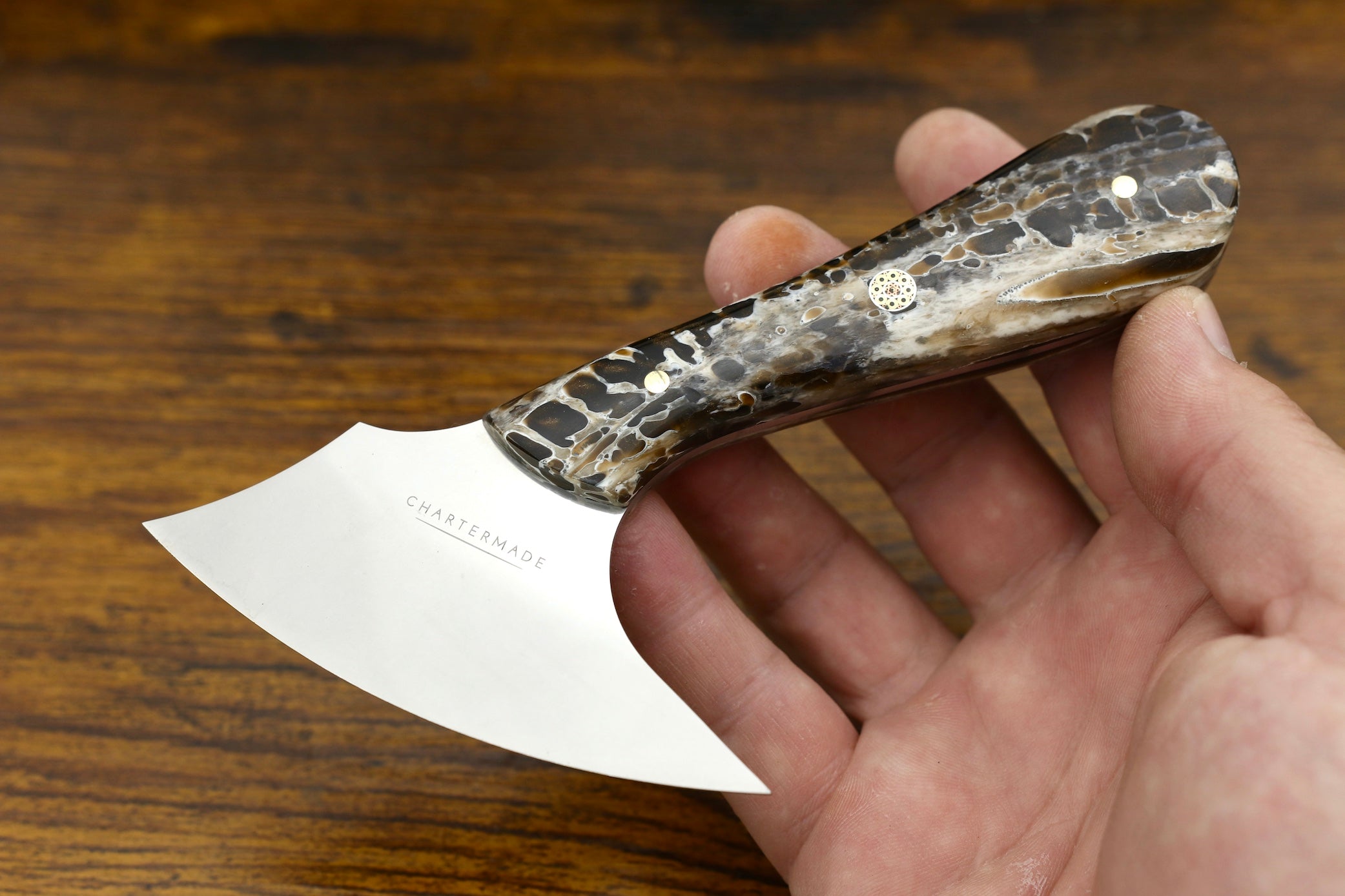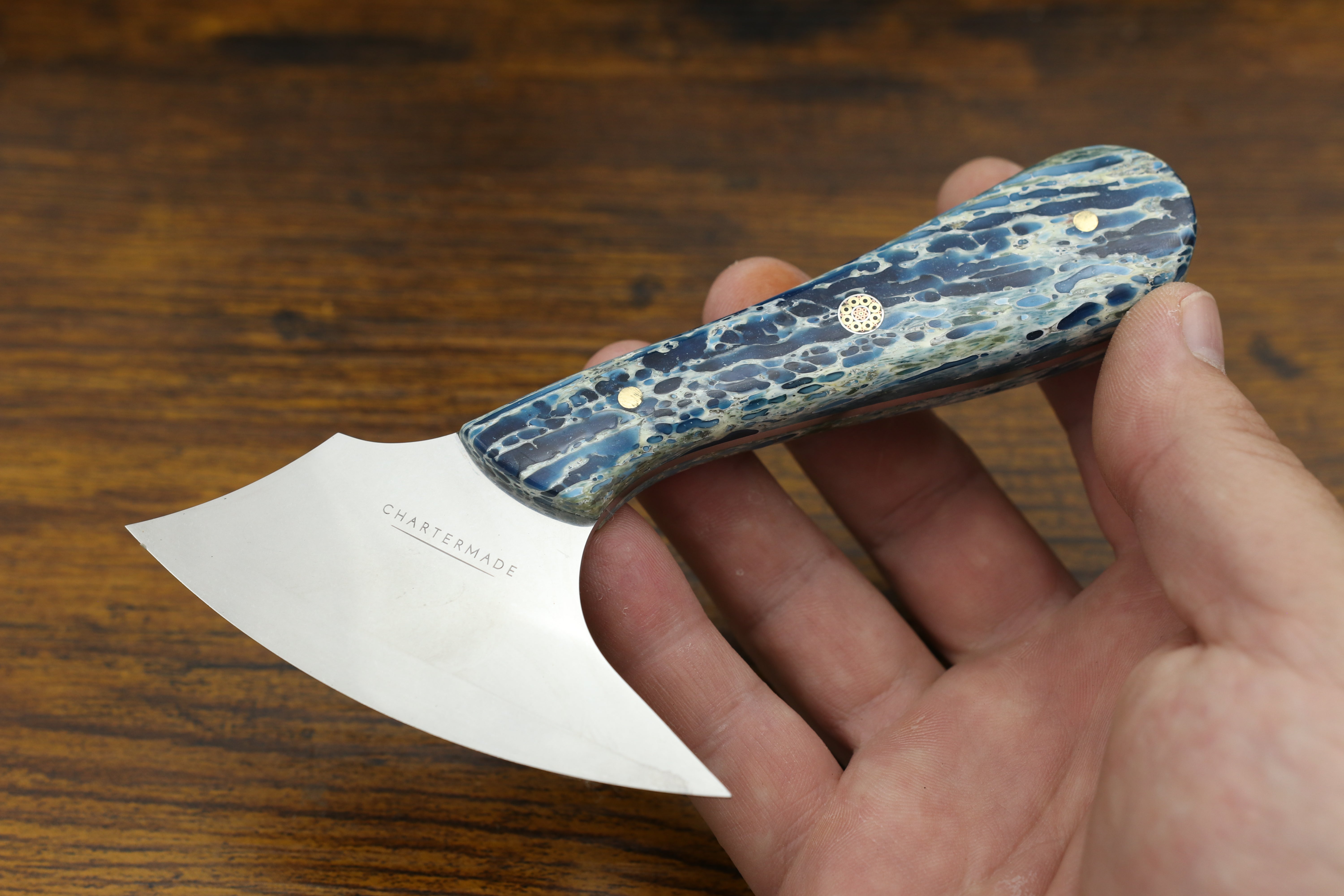The handle is finished with an intricate mosaic pin in between 2 brass pins. The blade is made from Böhler-Udderholm N690 steel and has a polished finish.
